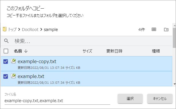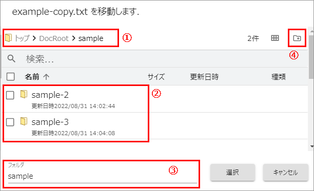 移動/コピー先のフォルダを予め選択した後に対象ファイル/フォルダを選択します。