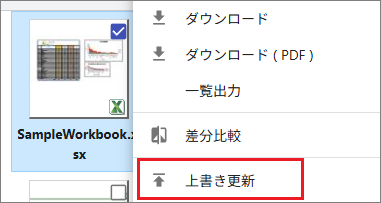 または1つのファイルにチェックを入れて[ファイル操作 > 上書き更新]を選択します。ファイル選択ダイアログが表示されるのでアップロード対象のファイルを選択します。